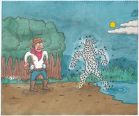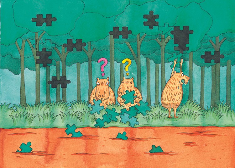 そこで、今回の展示作品の一枚を例に、アイデア発想の経緯をお伺いしたいとお願いしたところ、選んでくれたのは「陸の豊かさも守ろう」をテーマにした「ジグソーアマゾン」(写真上)。森林伐採によってピースが抜け落ちた森を前に困惑するカピバラたちが描かれているが、本田さんご自身がアマゾンを訪れた際、同じように困惑させられた経験があるという。