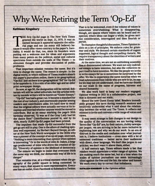 しかし、NYTオピニオン編集部のキャスリーン・キングズバリ編集長は26日に配信した記事で、この名称が「古い時代と、古い紙の新聞のデザインの遺物だ」と指摘。「目的は変わっていないが、名前を変える必要がある」として、今後は社外からの寄稿を「ゲスト・エッセー」と表現すると発表した。「Op-Ed」が「新聞の業界用語」であるとも述べ、読者に対してはより直接的で明確な言葉を使うべきだ、とも述べた。