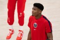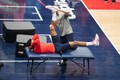 試合前、コートサイドでストレッチをする八村選手=ワシントン、ランハム裕子撮影、2021年3月4日