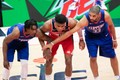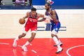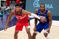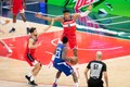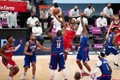 転倒したベルターンス選手に手を差し伸べるビール選手と八村選手=ワシントン、ランハム裕子撮影、2021年3月4日