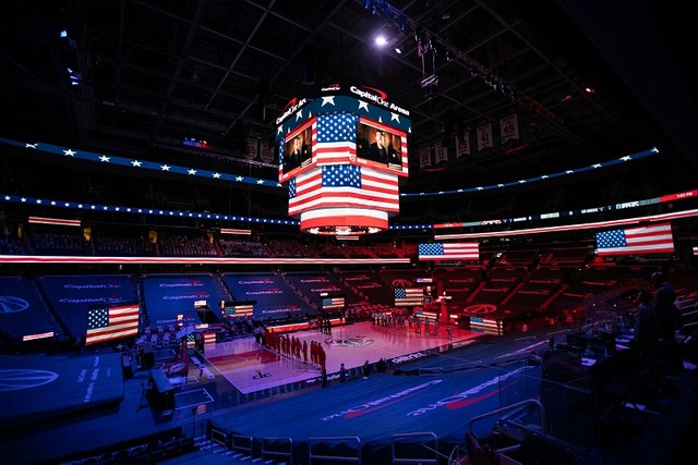 ウィザーズとクリッパーズの試合前、国歌斉唱する両チームの選手たち。観客席は「キャピタル・ワン」と書かれたカバーで覆われている=ワシントン、ランハム裕子撮影、2021年3月4日