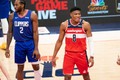 ロサンゼルス・クリッパーズとの試合中、笑顔を見せる八村選手(右)=ワシントン、ランハム裕子撮影、2021年3月4日