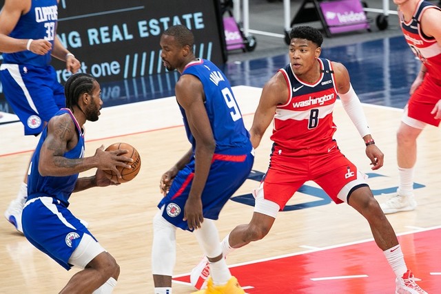 ロサンゼルス・クリッパーズとの試合でプレーする八村選手(中央)=ワシントン、ランハム裕子撮影、2021年3月4日