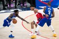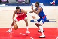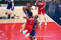 ロサンゼルス・クリッパーズとの試合でプレーする八村選手(左)=ワシントン、ランハム裕子撮影、2021年3月4日