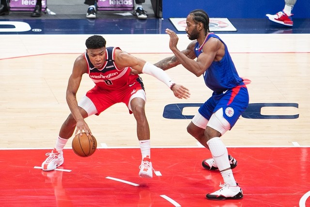 ロサンゼルス・クリッパーズとの試合でレナード選手をマークする八村選手(左)=ワシントン、ランハム裕子撮影、2021年3月4日