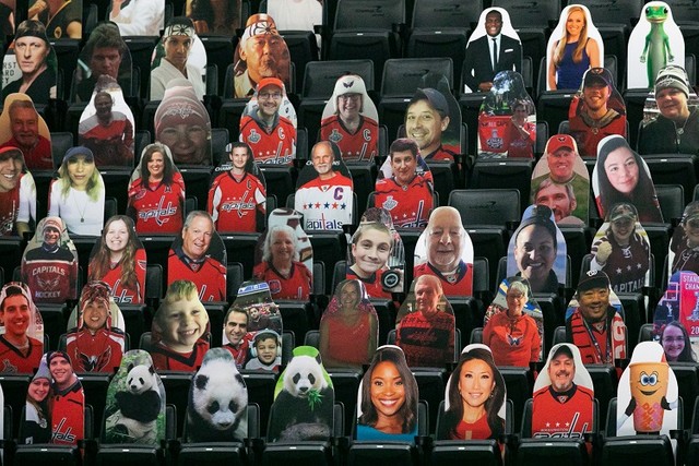 観客席に並べられたファンの顔写真。前列にはパンダの姿も=ワシントン、ランハム裕子撮影、2021年3月4日