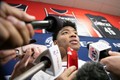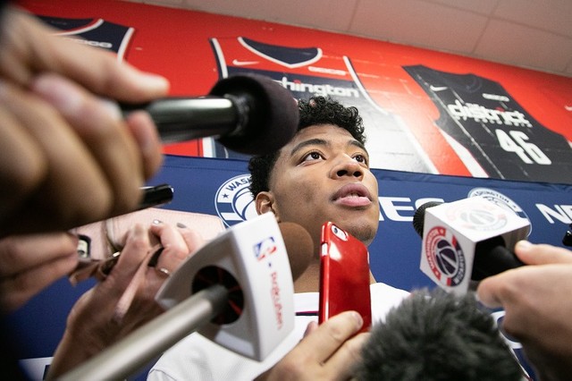 ヒューストン・ロケッツとの試合後、報道陣の囲み取材に応じる八村選手。マイクが顔に当たりそうなほどの近距離で取材が行われていた=ワシントン、ランハム裕子撮影、2019年10月30日