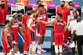 ロサンゼルス・クリッパーズとの試合のタイムアウト中、真剣な顔で話し合うウィザーズの選手たち=ワシントン、ランハム裕子撮影、2021年3月4日