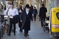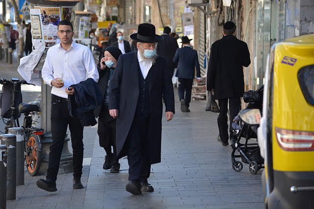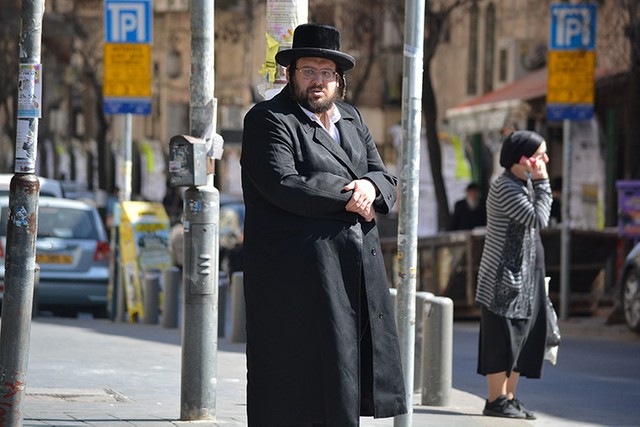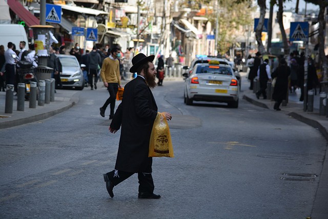 伝統的な黒ずくめの服装に身を包み、信号待ちをする超正統派ユダヤ教徒の男性。マスクをしていない人も多い=2021年2月15日、エルサレムのメアシェアリーム地区、高野遼撮影