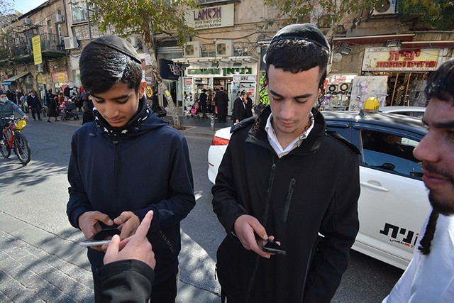 超正統派ユダヤ教徒の若者たち。最近は携帯電話をみんな持っている=2021年2月15日、エルサレムのメアシェアリーム地区、高野遼撮影