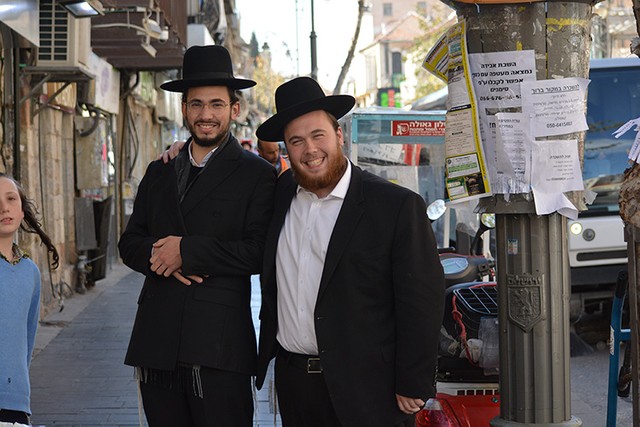 伝統的な黒ずくめの服装に身を包んだ超正統派ユダヤ教徒の男性たち。排他的なイメージが強いが、中には笑顔で話しかけてきてくれる人もいる=2021年3月5日、エルサレムのメアシェアリーム地区、高野遼撮影