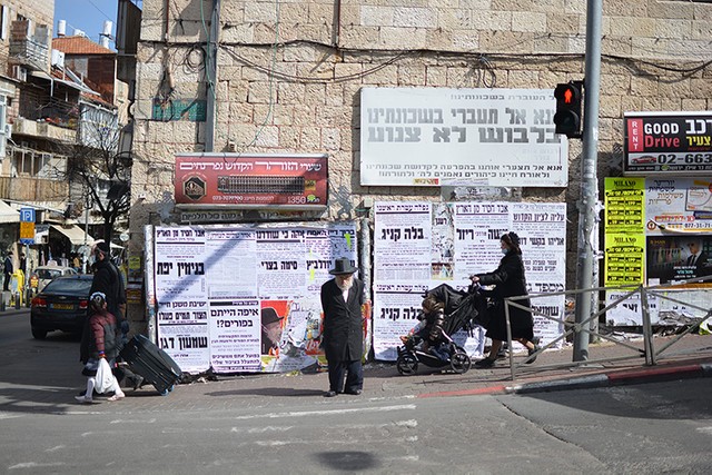 超正統派の地区には、至るところにポスター「パシュケビル」が貼られている。インターネットやテレビを使わないため、葬儀の予定などを知らせる重要な情報源だ=2021年3月5日、エルサレムのメアシェアリーム地区、高野遼撮影