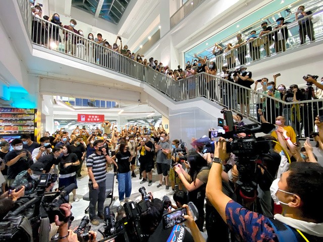 輪の真ん中には、17日に香港国家安全維持法(国安法)違反容疑で逮捕され、保釈された同紙の陳沛敏副社長ら幹部の姿があった。陳氏らが社員に「ありがとう」と手を振ると、上階まで吹き抜けでつながる階段から記者たちが身を乗り出し、「お疲れさま」と両手を振って応えた。