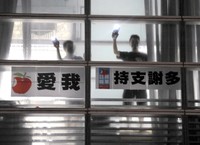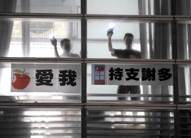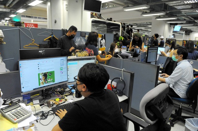 23日午後11時40分、リンゴ日報本社。朝日新聞記者が取材許可を得て社内に入ると、2階にある編集局の中央に新聞作りを終えた100人余りの記者や編集者が輪を作り、大きな拍手と「オー」という歓声が響き渡っていた。