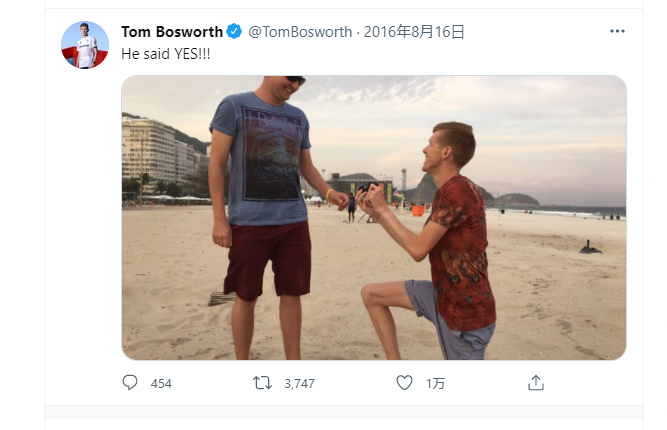 【写真】リオのビーチでプロポーズしたトム・ボスワースさん