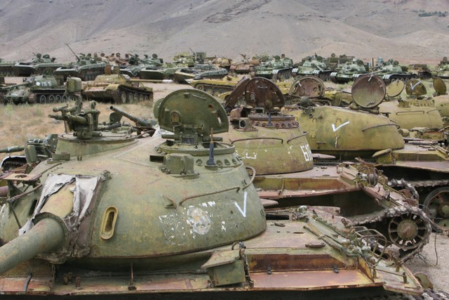 アフガニスタンに侵攻した際、ソ連軍が使い、遺棄された戦車=2007年5月、アフガニスタン東部のパルワン州