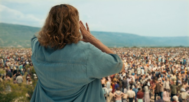 国連施設に押し寄せたボシュニャク人の難民らに呼びかける主人公アイダ(手前)=「アイダよ、何処へ?」より。©2020 Deblokada/coop99 filmproduktion/Digital Cube/N279/Razor Film/Extreme Emotions/Indie Prod/Tordenfilm/TRT/ZDF arte