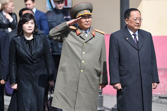 北朝鮮の(右から)李容浩外相、朝鮮人民軍の李永吉総参謀長、崔善姫第1外務次官=2019年4月26日、ロシア・ウラジオストク、竹花徹朗撮影