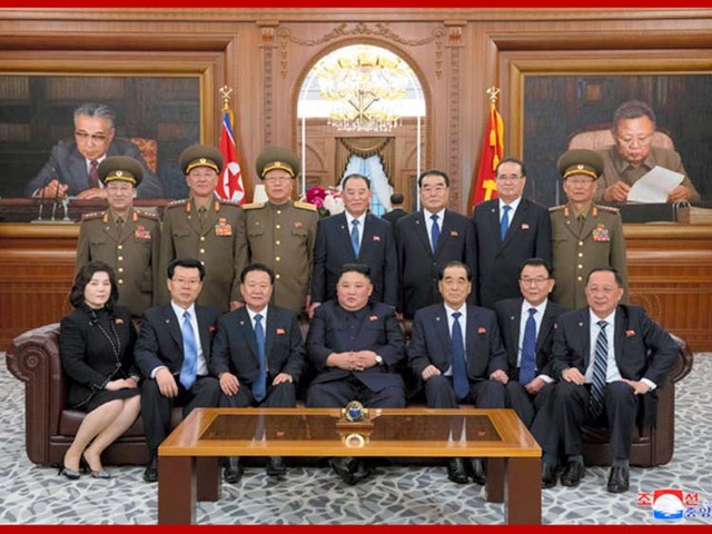 金正恩氏(前列中央)を中心に、北朝鮮高官・将校ら勢揃いし、2019年4月12日に撮影された記念写真=朝鮮中央通信ホームページから。崔善姫第1外務次官(前列左端)が、李永浩外相(当時、前列右端)より上席に座り、日米韓の関係者を驚かせた