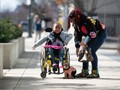 医療施設でのリハビリの合間に、休憩するため近くのコーヒーショップへ向かうマイオナちゃん(左)と母親のヒントンさん=メリーランド州ボルチモア、ランハム裕子撮影、2022年3月3日