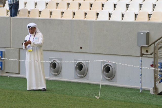 ルサイルスタジアムのピッチ脇には冷気を送る通気口が設置されている=2022年4月1日、カタール・ルサイル、朝日新聞社