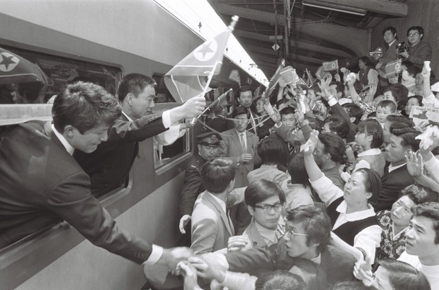 【約50年前の画像】北朝鮮へ帰国するため列車に乗り込んだ在日朝鮮人と旗を振って見送る人たちでごった返す名古屋駅