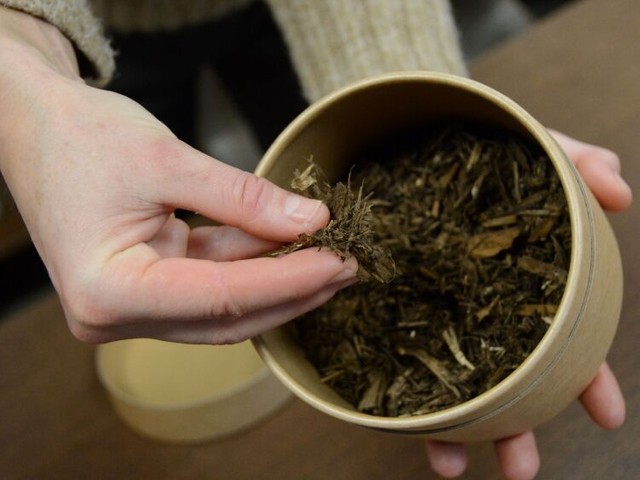 米西部ワシントン州シアトルの葬儀社「リコンポーズ」の代表カトリーナ・スペードさん(45)が差し出した小さな箱をのぞくと、腐葉土を乾燥させたような薄茶色の土が見えた。
