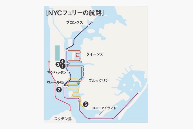ニューヨーク市にある五つの区のうち、北米大陸と地続きなのは北のブロンクスだけだ。マンハッタン、クイーンズ、ブルックリン、スタテン島は川で隔てられている。NYCフェリーはこの5区すべてで運航している。