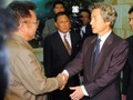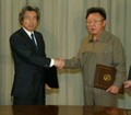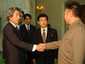 日朝首脳会談を終え握手する金正日総書記と小泉純一郎首相、中央は飯島勲首相秘書官、右は山崎正昭官房副長官=2004年5月22日、北朝鮮・平壌郊外の大同江迎賓館で、代表撮影