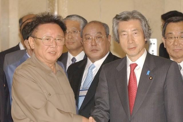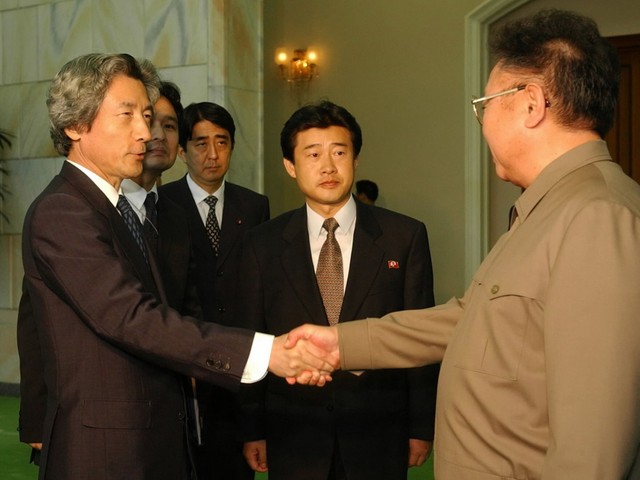 史上初の日朝首脳会談を前に北朝鮮の金正日総書記(右)と握手を交わす小泉純一郎首相。奥は安倍晋三官房副長官=2002年9月17日、 北朝鮮・平壌市の百花園迎賓館、代表撮影