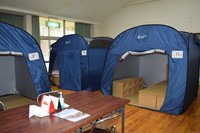 この避難所に昨年11月に入った仮寛佳(かり・ひろよし)さん(64)は「テントがあると、人目を気にせず着替えもできるし、プライバシーがあっていいよね。床の上の布団で寝るよりベッドのほうがよく眠れる」と話す。