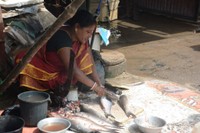 午前中からすでにじりじりとした暑さのなか、魚市場に接する岸辺に漁師たちのボートが次々と戻ってきた。50センチほどもあるぼってりとしたおなかの魚、ガサガサと動くカニ、山盛りのエビ。女性たちが刃物を使い、慣れた手つきで次々に魚の頭を落としていく。どの店も活気にあふれている。