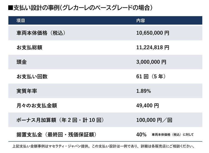 マセラティでは、車両本体価格の一部を将来の残存価値として据え置く、残価保証型オートローンプログラム「Tridente 50(トリデンテ・チンクアンタ)」を用意している。これにより、車両の代金すべてを月々の支払いに分散させる必要がなくなり、月々の負担を現実的な水準に抑えることが可能になる。