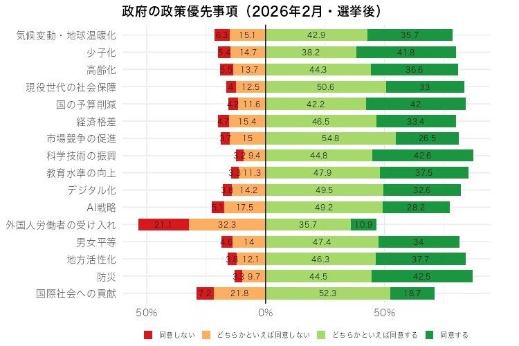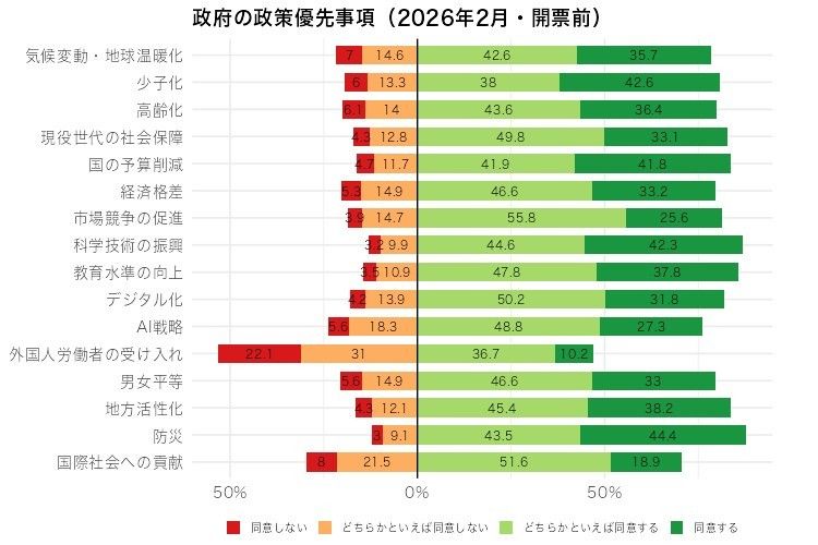 「外国人労働者の受け入れ」を含めた政策の優先順位については、2022年と2023年にも調査をしている。このときの政策は14項目で、回答カテゴリーが多少違うが、比較可能な内容だ。2022、2023年は、賛成と反対に大別すると反対が35.5%、36.6%。つまり、22年と26年では約18ポイントも反対が増えた。他の項目では、反対の率が減少か変わらないものがほとんどで、増えても数ポイントだったのに比べると、顕著な変化が見られる。